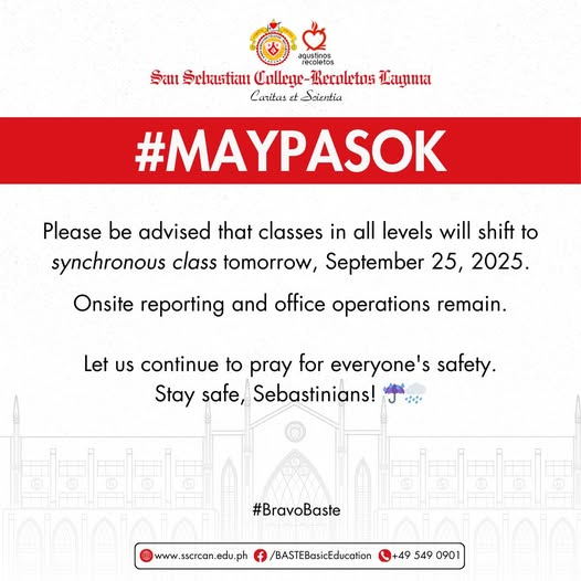 Due to the heavy rains from typhoon Opong, please be advised that classes in all levels will shift to synchronous online classes tomorrow, September 25, 2025. On-site reporting and office operations will continue.