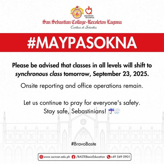Due to the heavy rains from typhoon Opong, please be advised that classes in all levels will shift to synchronous online classes tomorrow, September 25, 2025. On-site reporting and office operations will continue.